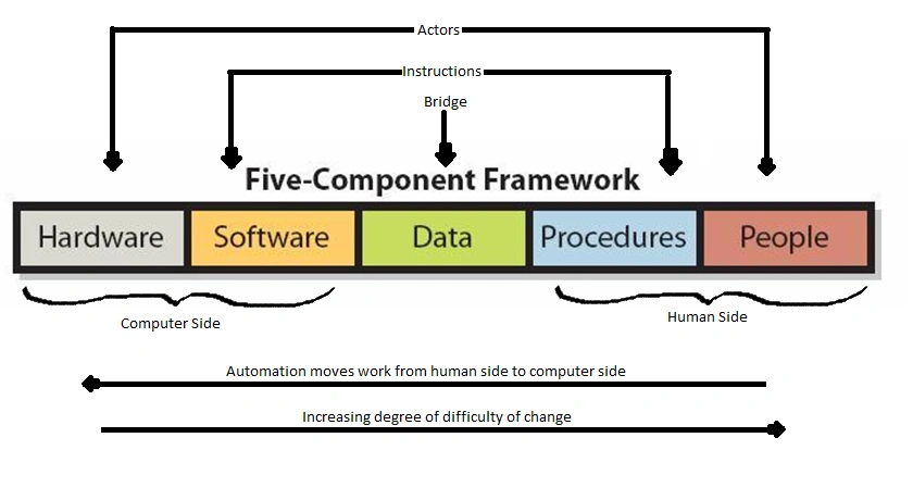 So, what goes into an information system? Almost everything required for a productive modern office: technology, software, data, communication, and people. Almost every information system contains these components in some fashion.