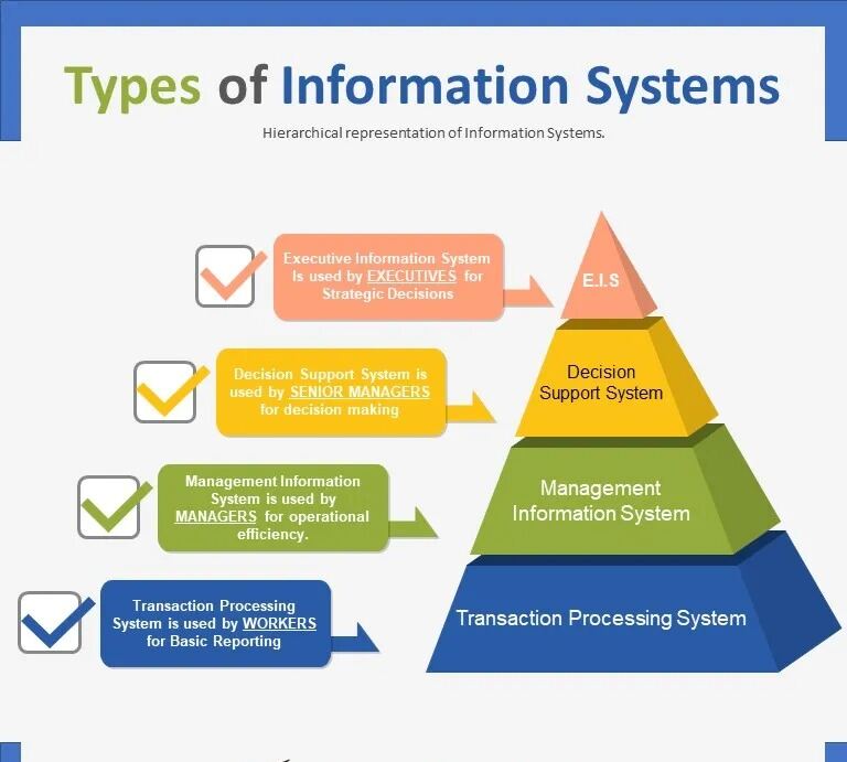 • Management information systems – This is the second type of information system, which consists of hardware and software integration that allows the organisation to fulfil its primary duties. They assist in gathering information from numerous web systems. The system does not save the data acquired; rather, it analyses it in a productive manner to aid in organisational administration.