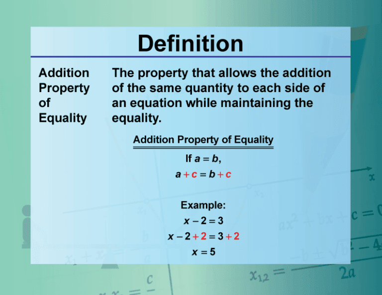 The addition property of equality is a fundamental principle in mathematics that states that if you add the same quantity to both sides of an equation, the equation remains balanced and true.