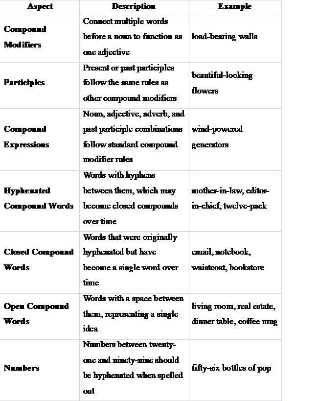 Here’s a table summarizing the different aspects of hyphenation conventions: