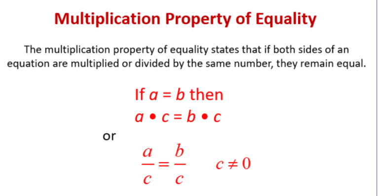 By using this property, we can simplify or solve equations and isolate the variable to find its value. It is important to note that the multiplication property of equality can only be applied to multiplication and not to addition or subtraction.