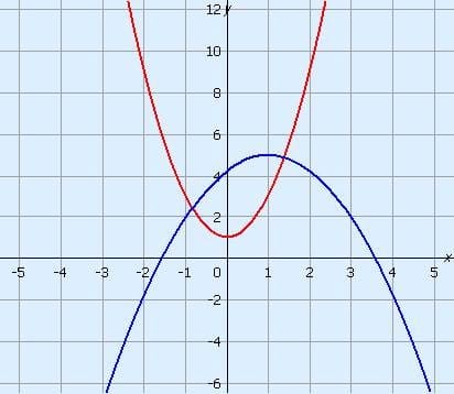- The vertex of the blue parabola, which opens downward, is at the point (1, 5).